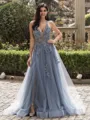 This dress is an A-line style with a V-neckline and sleeveless design. It is adorned with delicate appliques lace and features a sweep train made of tulle. The dress is enhanced by a corset bodice, adding a touch of elegance and a flattering fit.