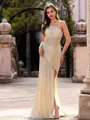 Embrace modern elegance in this sheath dress with a one-shoulder design, sleeveless silhouette, and chic pleats. The dress is beautifully completed with a sweeping train, offering a stylish and sophisticated look.