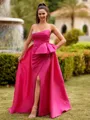 This sophisticated sheath dress features a straight neckline and a sleeveless design, creating a sleek, streamlined look. Crafted from luxurious taffeta, the dress offers a smooth, structured fit that accentuates the figure. A beautiful bow detail at the waist adds a feminine and charming touch, enhancing the overall elegance of the gown. The floor-length hemline creates a graceful, elongated silhouette, making it perfect for formal events or weddings. Combining simplicity with a delicate detail, this dress exudes modern sophistication and timeless beauty.