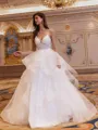 Sleeveless ball gown wedding dress with a V-neck, lace appliques, and a sweep train in tulle fabric.