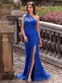 Exude grace in this sheath dress featuring a one-shoulder design, sleeveless silhouette, and adorned with delicate flower embellishments. The dress is beautifully completed with a sweeping train and a tulle corset, creating a captivating and stylish ensemble.