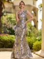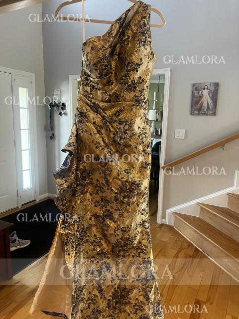 A stunning sheath Mother of the Bride dress featuring a one-shoulder design and sleeveless cut. The dress is adorned with beautiful ruffles that add texture and movement, creating a feminine and elegant look. The floor-length silhouette enhances its graceful appeal, making it an ideal choice for a sophisticated and memorable appearance on the big day.