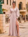 An exquisite A-line prom dress crafted from lightweight, flowing chiffon, featuring delicate ruffle accents and a flattering V-neckline. The long sleeves add a touch of sophistication, while the floor-length silhouette creates a graceful, elegant look perfect for making a stylish entrance.