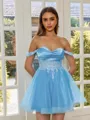 This stunning A-line dress features an elegant off-the-shoulder neckline and a sleeveless design that beautifully highlights the shoulders and neckline. Delicate lace appliques adorn the bodice and skirt, adding intricate texture and romantic charm. Crafted from soft tulle, the dress offers lightness and graceful movement. The corset-style bodice provides a flattering, structured fit, while the short or mini length creates a youthful and stylish silhouette. Perfect for special occasions where timeless elegance meets modern flair.