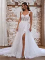 Graceful A-line wedding dress with an off-the-shoulder neckline, sleeveless design, and intricate lace appliques. The gown extends into a cathedral train crafted from delicate tulle, and a corset detail adds a touch of romance and sophistication, creating a timeless and elegant bridal ensemble.