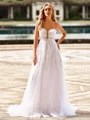 Emanate elegance in this A-line wedding dress, featuring a sweetheart neckline, sleeveless design, and delicate lace appliques. Crafted from airy tulle, it boasts a charming court train and a flattering silhouette. Perfect for a bride seeking timeless sophistication with a touch of romance on her wedding day.