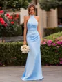A chic sheath bridesmaid dress with a halter neckline and sleeveless design. Crafted from luxurious charmeuse fabric, this floor-length dress offers a smooth, lustrous finish that beautifully contours the body. Pleated details add texture and flow, enhancing its elegant and sophisticated silhouette. Perfect for a modern yet timeless wedding look.