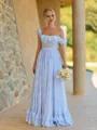 This stunning bridesmaid dress features an A-line silhouette with a graceful one shoulder neckline and sleeveless design. The floor length skirt flows beautifully, while soft ruffles add a romantic touch. The fitted corset bodice enhances the figure, creating an elegant and timeless look perfect for weddings and special occasions.