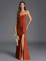 A sheath bridesmaid dress featuring a cowl neckline and sleeveless design. Made from flowing chiffon, this floor-length dress is adorned with delicate ruffles, offering a sophisticated and graceful look for any formal occasion.