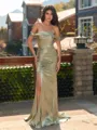 • Extravagant Sheath Off-the-Shoulder Pleated Sweep Train Silk Like Satin Bridesmaid Dress