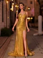 Extravagant Sheath Spaghetti Straps Sweep Train Sequins Corset Prom Dress - Glamlora