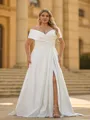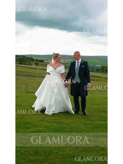 This plus size A-line wedding dress features an off-the-shoulder neckline with a sleeveless design. The fitted corset bodice enhances the figure, while the pleated satin skirt flows into a graceful court train, creating an elegant and flattering bridal look.