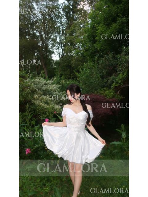 This chic A-line wedding dress features an off-the-shoulder neckline and a sleeveless design, offering a modern and elegant look. Made from silk like satin, it has a smooth, figure-flattering fit with delicate pleating for added texture. The short/mini length adds a playful and contemporary touch, perfect for intimate weddings, receptions, or elopements.