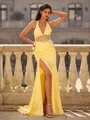 Fashion Sheath Halter Bow Sweep Train Silk like Satin Corset Prom Dress