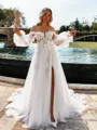 Flattering A-line Sweetheart Long Sleeves Appliques Lace Chapel Train Tulle Corset Wedding Dress