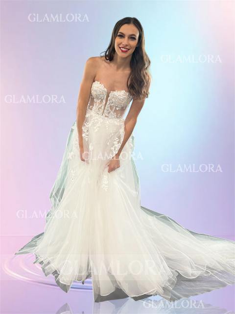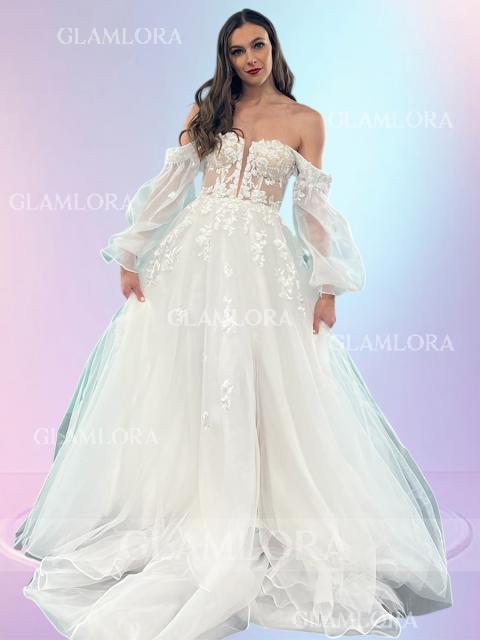 Exude timeless romance in this A-line wedding dress, boasting a sweetheart neckline, long sleeves, and delicate lace appliques. Crafted from airy tulle, it features a graceful chapel train and a flattering corset bodice. Perfect for a bride seeking classic elegance with a hint of whimsical charm on her special day.