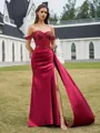 This dress is a sheath-style gown featuring an off-the-shoulder neckline and a sleeveless design, creating a timeless and elegant look. Crafted from silk like satin, it offers both comfort and a flattering, form-fitting silhouette. The dress is adorned with delicate lace appliques, adding intricate detail and sophistication. The corset-style bodice enhances the waist, providing a structured and shapely fit, while the sweep train adds a graceful, dramatic finish. Perfect for formal occasions, this dress combines classic beauty with modern elegance.