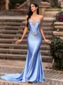 A glamorous sheath prom dress featuring a straight, sleeveless neckline adorned with sparkling rhinestones. Flowing into a chapel-length train, it creates an elegant and sophisticated silhouette perfect for formal events and special occasions.