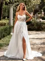 Capture timeless romance in this A-line wedding dress, featuring delicate spaghetti straps, a sleeveless design, and intricate lace appliques. Crafted from airy tulle, it showcases a charming court train and a flattering corset bodice. Perfect for a bride seeking classic elegance with a touch of modern sophistication on her special day.