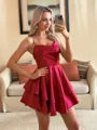 Chic A-line silk-like satin dress, featuring spaghetti straps and cascading ruffles for a short and playful look.