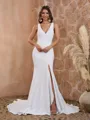 Sleek sheath wedding dress with a V-neck, sleeveless design, and court train. Crafted from stretch crepe, the gown exudes modern elegance, creating a sophisticated and flattering bridal look.