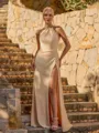 A stylish sheath bridesmaid dress featuring a halter, sleeveless design with delicate pleating. Made from soft jersey fabric, it flows to a floor-length hem, creating a comfortable yet elegant silhouette perfect for weddings and special occasions.