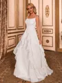 This elegant A-line wedding dress features a flattering spaghetti strap neckline and a sleeveless design. Crafted from flowing chiffon with soft ruffle detailing, it is designed with a structured corset bodice for a flattering fit and flows into a graceful sweep train, creating a romantic and refined bridal look.