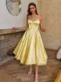 This elegant A-line dress features slender spaghetti straps and a sleeveless design, offering a delicate and feminine silhouette. Crafted from smooth silk-like satin, the fabric drapes beautifully with a soft sheen that adds a touch of luxury. The structured corset bodice flatters the figure, while the tea-length skirt creates a timeless and graceful look. Perfect for weddings, cocktail events, or special occasions, this dress blends classic charm with modern sophistication.