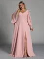 • Glamorous A-line V-Neck Long Sleeves Bow Floor-Length Chiffon Plus Size Bridesmaid Dress