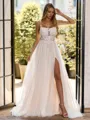 This elegant A-line wedding dress features delicate spaghetti straps and a sleeveless design that beautifully showcase the shoulders. Crafted from soft tulle, the bodice is adorned with intricate lace appliques for a romantic and timeless touch. The corset waist cinches the figure for a flattering silhouette, while the chapel-length train adds graceful movement and classic elegance to your bridal look.