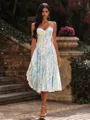 This A line spaghetti straps sleeveless tea-length dress features a flattering sleeveless design with thin straps and a flowing tea-length skirt. The elegant silhouette creates a graceful and sophisticated look, perfect for weddings, parties, or special occasions.