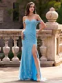 Radiate elegance in this sheath dress with an off-the-shoulder neckline, sleeveless design, and a sweeping train. The dress is adorned with lace detailing and a corset, creating a captivating and timeless ensemble.