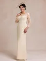 This floor-length chiffon mother of the bride dress features a sleek sheath silhouette, accentuated by a classic scoop neckline and elegant long sleeves. Delicate lace appliques adorn the ensemble, adding a touch of romance and femininity. Perfect for a mother who desires a sophisticated and graceful look for her daughter's wedding.