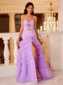 A romantic sheath dress with a sweetheart neckline and sleeveless design, crafted from soft tulle. Cascading ruffles add texture and movement, while the sweep train creates an elegant flow. Perfect for weddings or formal occasions, this dress combines femininity and sophistication.