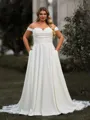 This plus size A-line wedding dress features an off-the-shoulder neckline with a sleeveless design, adorned with delicate lace appliques. Made from stretch crepe, the fitted bodice enhances the figure, while the flowing skirt extends into a graceful chapel train, creating a romantic and flattering bridal look.