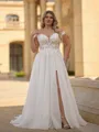 This plus size A-line wedding dress features an off-the-shoulder neckline with a sleeveless design, adorned with delicate lace appliques. The corset bodice flatters the figure, while the soft tulle skirt flows into an elegant court train, creating a romantic and timeless bridal look.