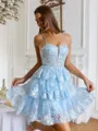 This A-line dress features delicate spaghetti straps and a sleeveless design for a light, airy feel. It's adorned with intricate lace appliques over soft tulle, adding a romantic and elegant touch. The corset bodice shapes the waist, and the short/mini length offers a playful yet sophisticated look - ideal for parties and special events.