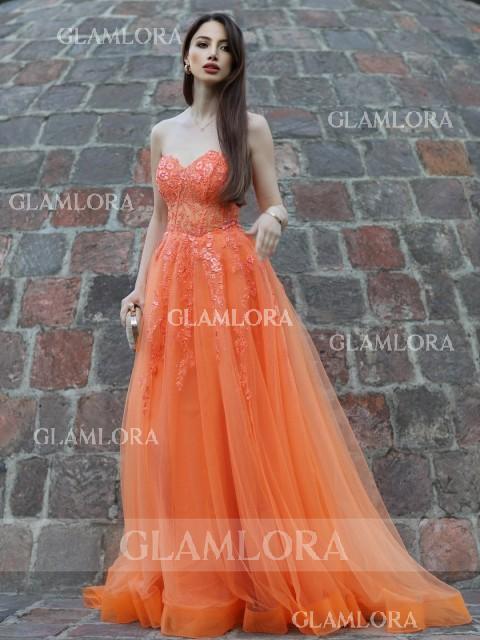 A romantic A-line dress with a sweetheart neckline and sleeveless design, crafted from soft tulle and adorned with delicate lace appliques. The corset bodice enhances the fit, while the sweep train adds a graceful, flowing touch. Perfect for weddings or formal occasions.