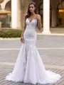 Make a statement in sophistication with this mermaid wedding dress, showcasing a flattering V-neckline and sleeveless design adorned with intricate lace appliques. Crafted from airy tulle, it flares out from the knees, creating a dramatic silhouette, and features a stunning chapel train. Perfect for the bride who desires timeless elegance with a touch of allure on her special day.