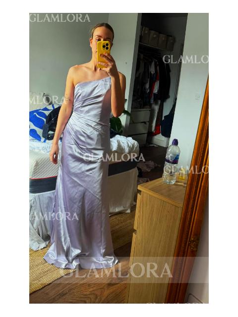 A sheath bridesmaid dress made from silk like satin, with a one-shoulder neckline and pleated details that elegantly extend into a floor-length design.