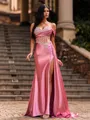 A glamorous sheath prom dress featuring a one-shoulder, sleeveless design adorned with sparkling rhinestones. Flowing into a graceful sweep train, it creates a sophisticated and elegant silhouette perfect for formal events and special occasions.