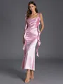 A sheath bridesmaid dress with thin straps and a sleeveless design. Made from silk like satin, this ankle-length dress features soft ruffles, offering a sleek yet romantic look that