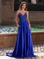• Gracious A-line V-Neck Appliques Lace Sweep Train Silk like Satin Prom Dress
