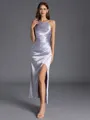 A sheath bridesmaid dress with a halter neckline and sleeveless design. Made from silk like satin, this ankle-length dress features pleated details, creating a sleek and stylish look that's perfect for a chic and modern bridal party.
