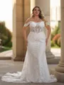 This plus size sheath wedding dress features an off-the-shoulder neckline with a sleeveless design, adorned with delicate lace appliques. The fitted lace corset bodice flatters the figure, while the skirt flows into an elegant chapel train, creating a sophisticated and timeless bridal look.