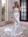 This graceful sheath wedding dress features a straight silhouette that elegantly flatters the figure. Made from luxurious silk-like satin, it is beautifully adorned with delicate lace appliques across the bodice and sleeves. The long sleeves add a sophisticated touch, while the structured corset waist enhances the shape for a perfect fit. A chapel-length train flows gracefully behind, adding timeless elegance to your bridal ensemble.