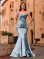 A form-fitting sheath dress with delicate spaghetti straps and a sleeveless design, adorned with rhinestones. It features a sweeping train for added elegance.