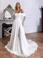 This sophisticated A-line wedding dress features an off-the-shoulder neckline and sleeveless design, offering a romantic and graceful silhouette. The bodice is adorned with delicate lace appliques that add timeless charm, while the stretch crepe fabric ensures a smooth, figure-flattering fit. Flowing into a chapel train, the dress adds a touch of grandeur without overwhelming. The built-in corset provides structure and support, enhancing the waistline beautifully. Perfect for the modern bride who loves classic elegance with a contemporary twist.