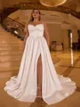 This plus size A-line wedding dress features slender spaghetti straps and a sleeveless design, with a fitted charmeuse corset bodice. The pleated skirt flows into a graceful sweep train, creating a flattering and elegant bridal look.