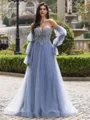 • Hot A-line Sweetheart Long Sleeves Appliques Lace Sweep Train Tulle Corset Convertible Prom Dress